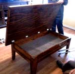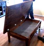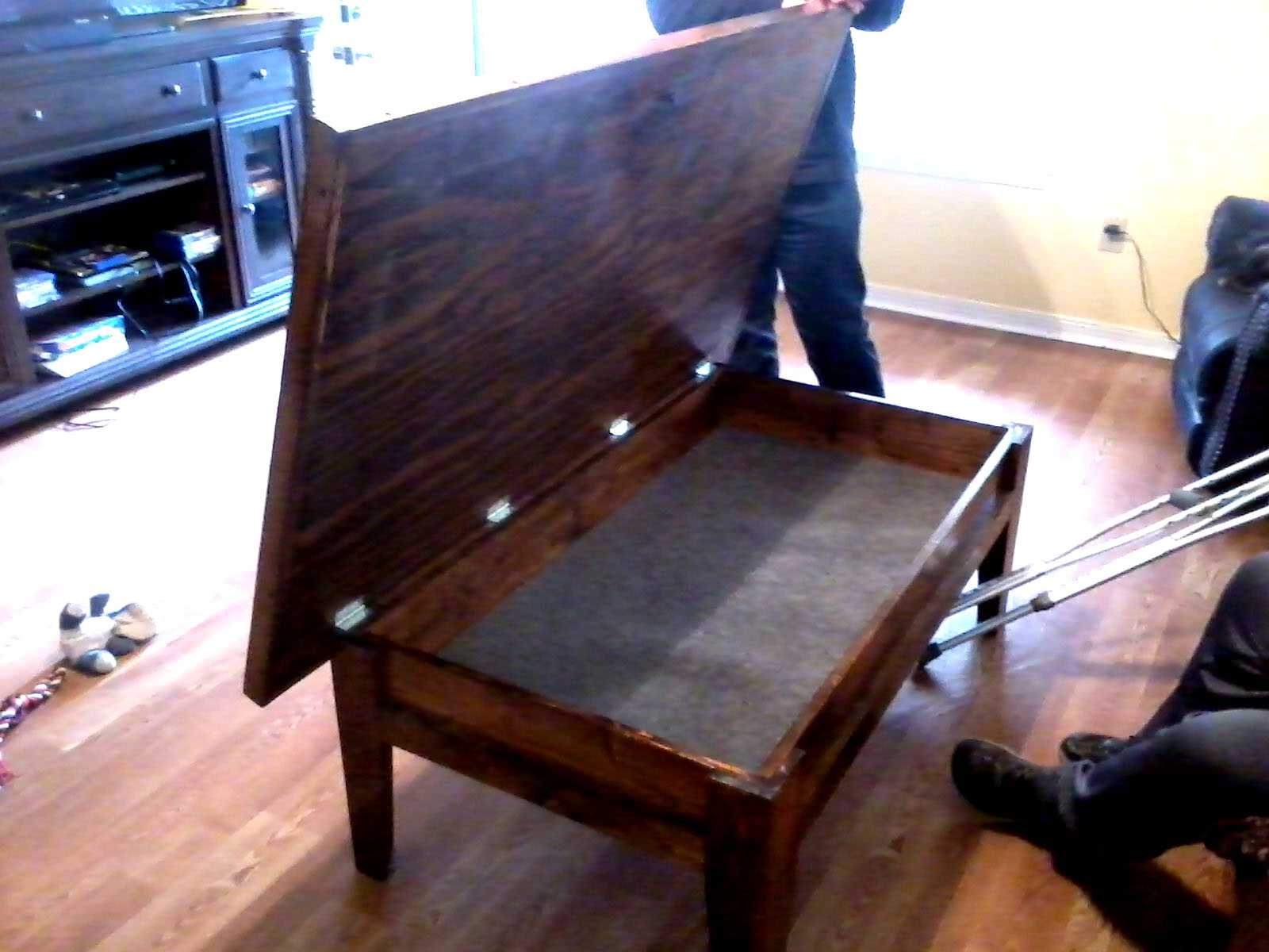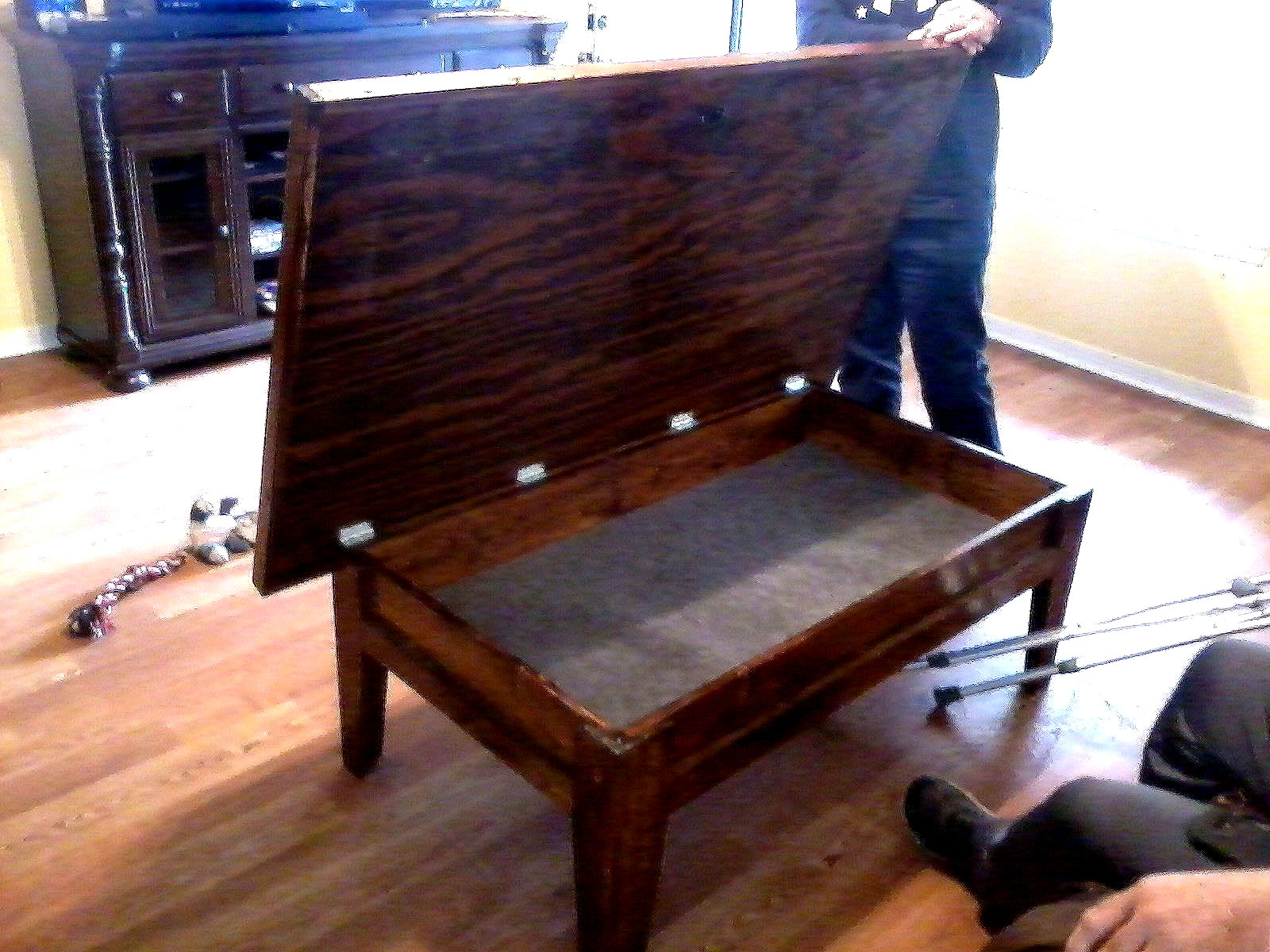 Everyone has something they need to hide! Guns, prescriptions, cash, jewelry...what is it for you? KEEP THOSE KIDS AND NOSEY FRIENDS OUT OF YOUR STASH! This are truly "one-of-a-kind" item for your "Man Cave". One of a kind hand made! Coffee Table The inside of the hidden compartment is 25.5" x 48" x 5" which is PLENTY of room to stash several rifles and other stuff too or just other stuff if you aren't into guns. If you did not know already that this table opened up you would never guess that it would open by just seeing it in the living room. Your friends can sit on the couch and place their drinks on it for years and never know there were weapons hidden inside. Even if they suspected they would never find the hidden latch that keeps it locked either. Custom made to order pieces do not go up for sale even to mailing list members. A small nonrefundable deposit is required for all custom made to order pieces. ----------------------------------------------------------------------------------------------------------------- If you* want to have first crack at all new "Hide-In-Plain-Sight" items for 48 hours before I post them to the general public email me with: "Hide it in plain sight please!" in the subject line and you will have it.