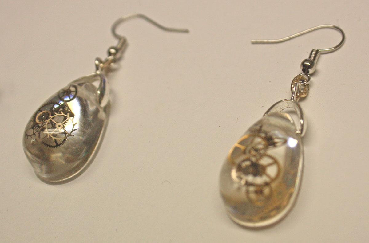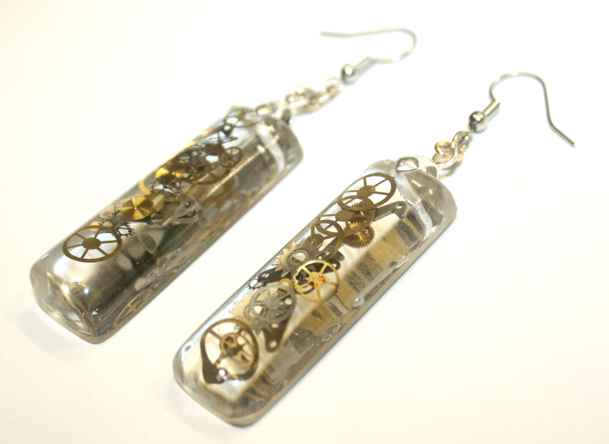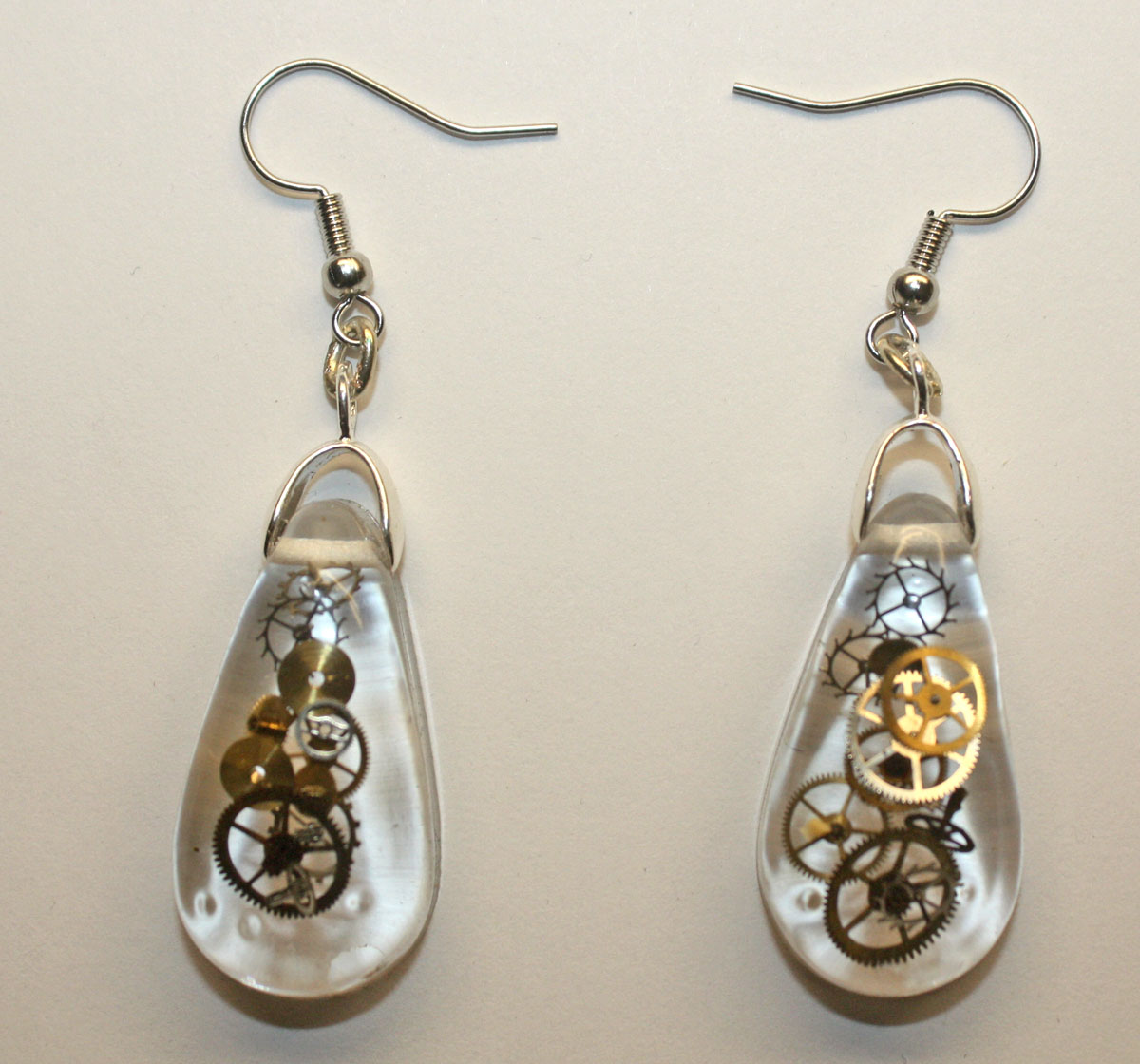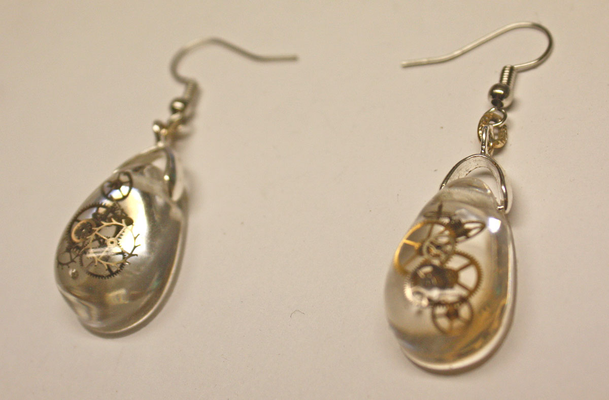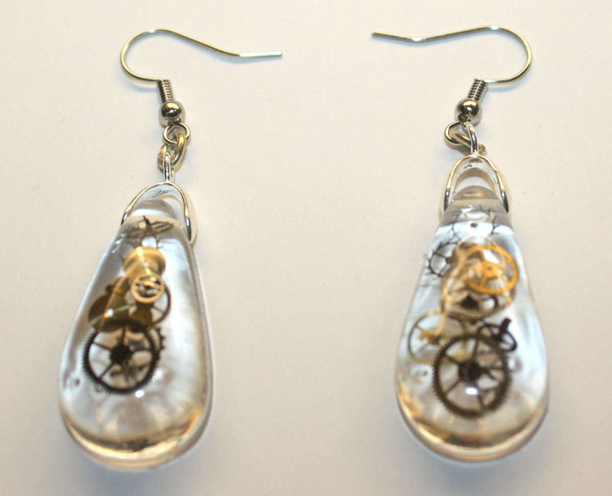 3D one of a kind Steampunk teardrop ear rings. Genuine antique watch parts encased in crystal clear