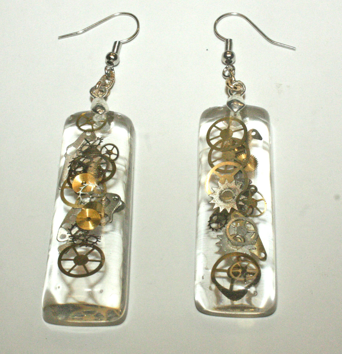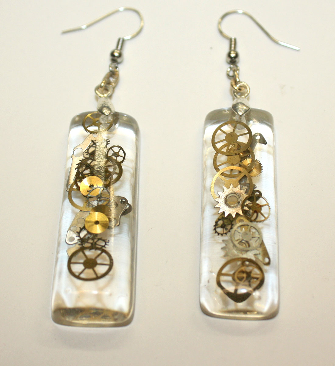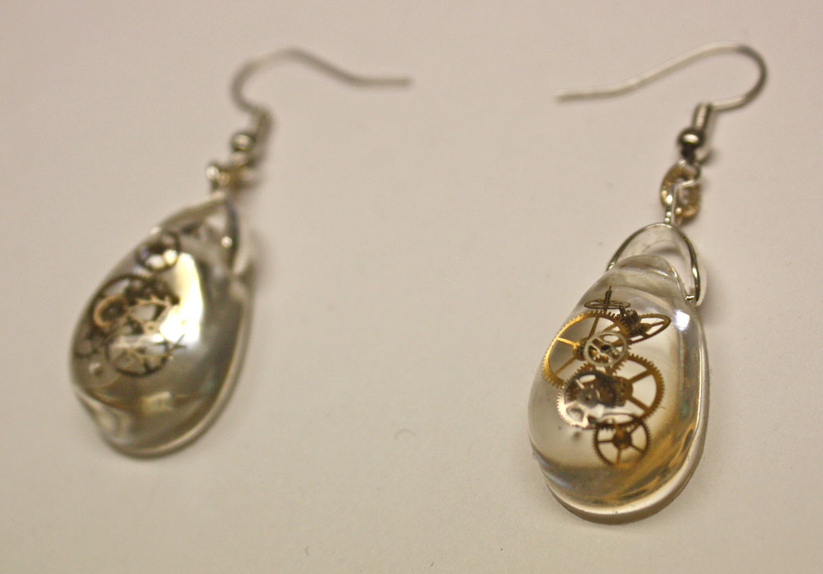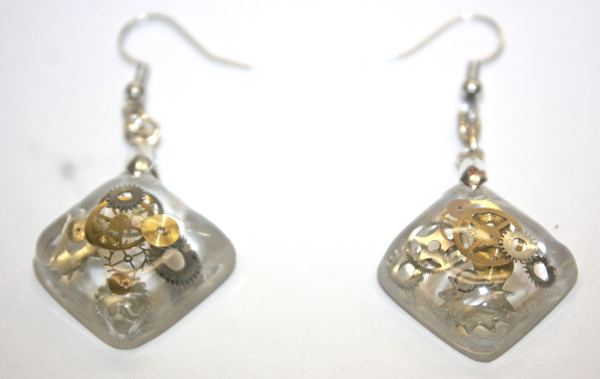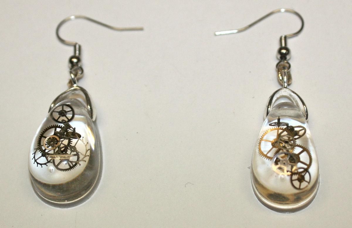 3D one of a kind Steampunk teardrop ear rings. Genuine antique watch parts encased in crystal clear