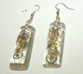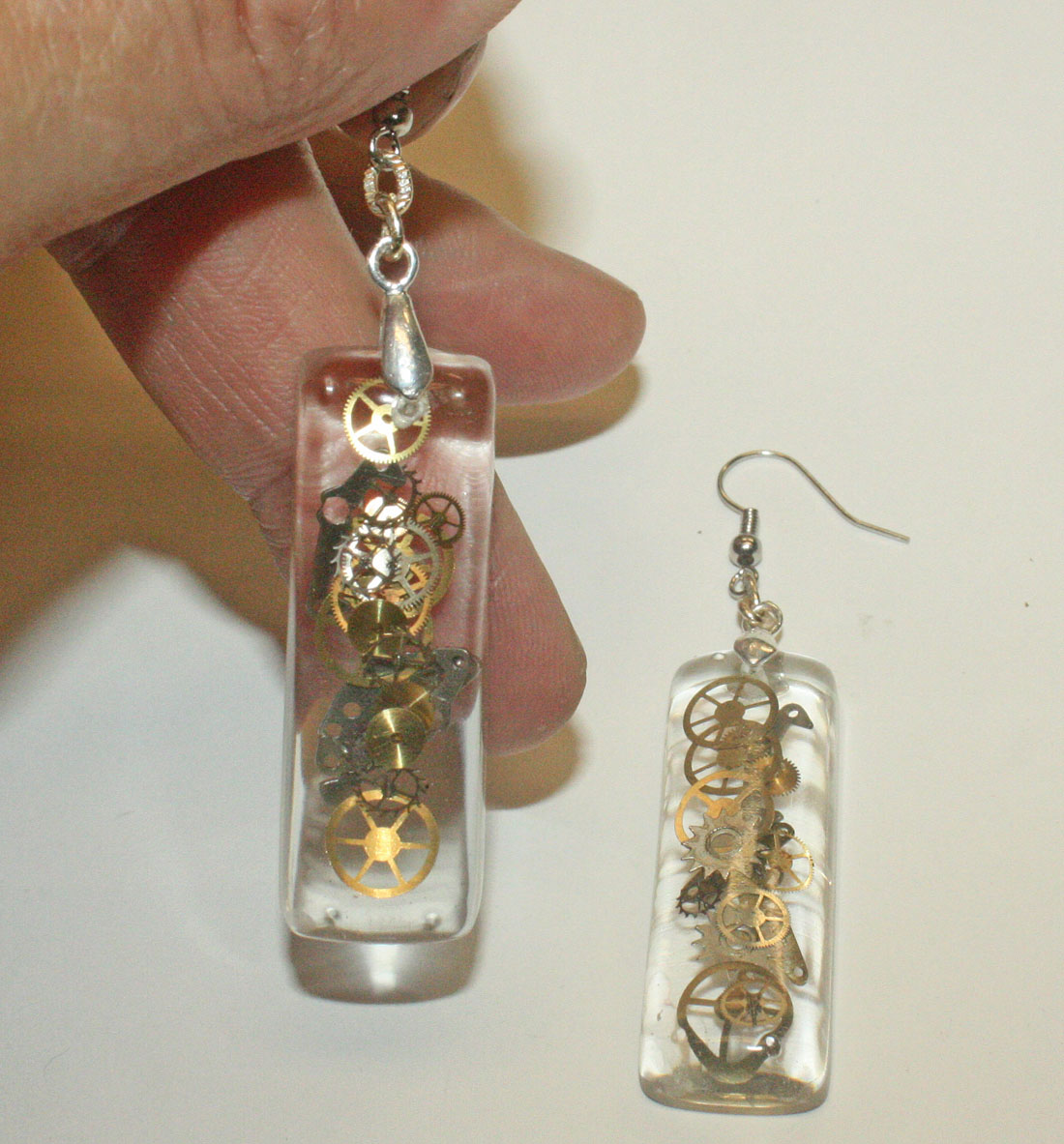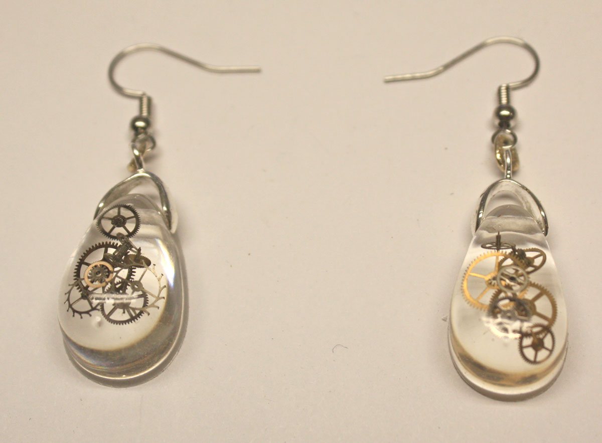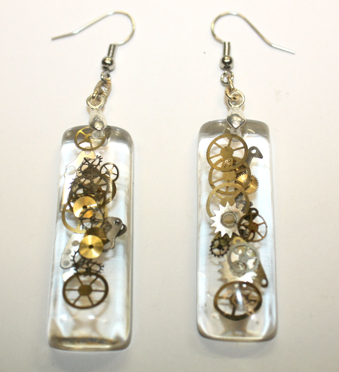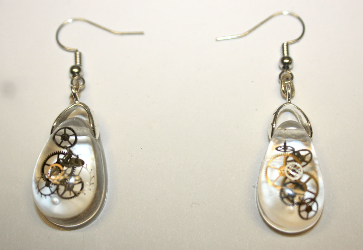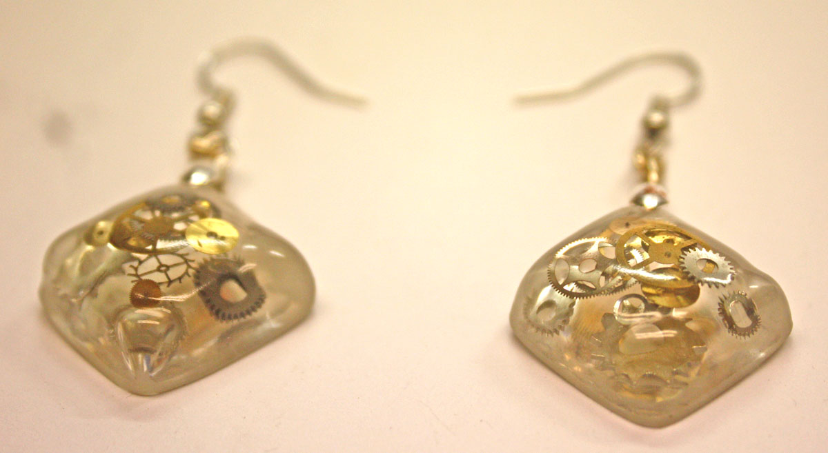 3D one of a kind Steampunk teardrop ear rings. Genuine antique watch parts encased in crystal clear