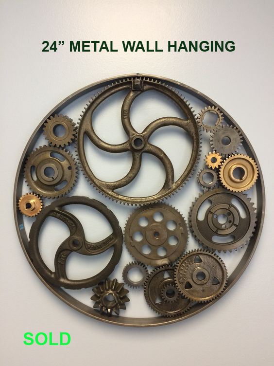 old, the large brass gear is from a grandfather clock over 100 years old and
